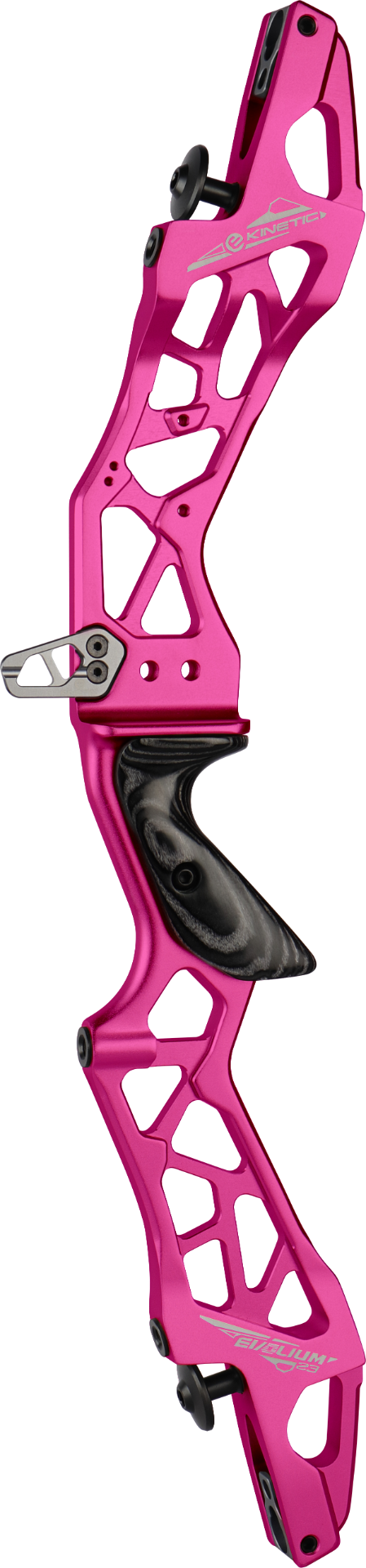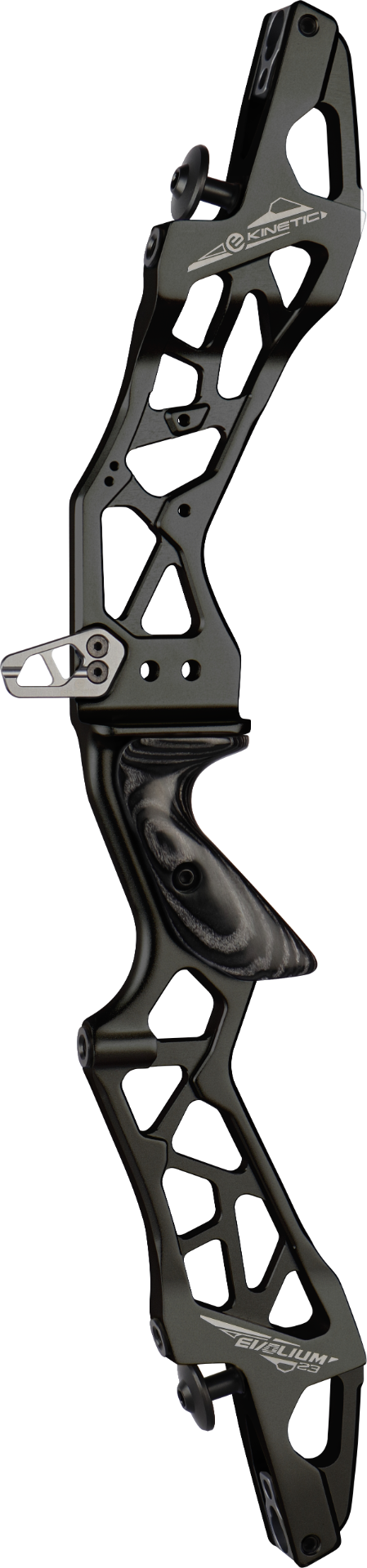 The Kinetic Evolium is a CNC-machined 25"" ILF riser made from 6063-T6 extruded aluminum, designed with a wider profile to enhance stiffness and accommodate higher draw weights. Combining practical features like a secure clicker extension, zero-tolerance limb alignment system, and classic wooden grip, the Evolium offers excellent value without compromising on performance or feel.